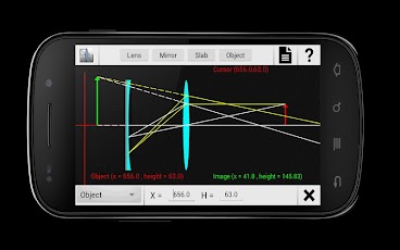Interaktīva aplikācija ģeometriskajai optikai - var izvietot abu veidu lēcas (Lens), spoguļus (Mirror), plātnes (Slab) un priekšmetus (Objects).