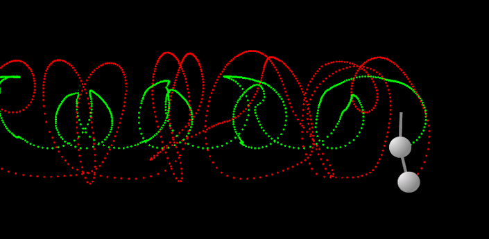 Var simulēt un pētīt haotisku dubultā svārsta kustību telpā.